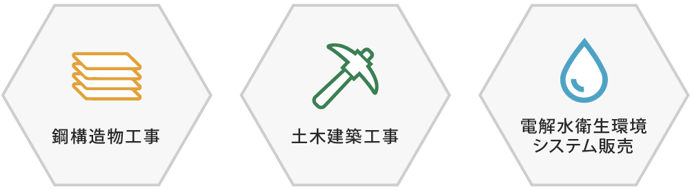 鉄骨製作・土木建築・衛生管理を通して、人々の生活や生命、人々の財産を守り、そして豊かな社会を築くための活動を行っています。